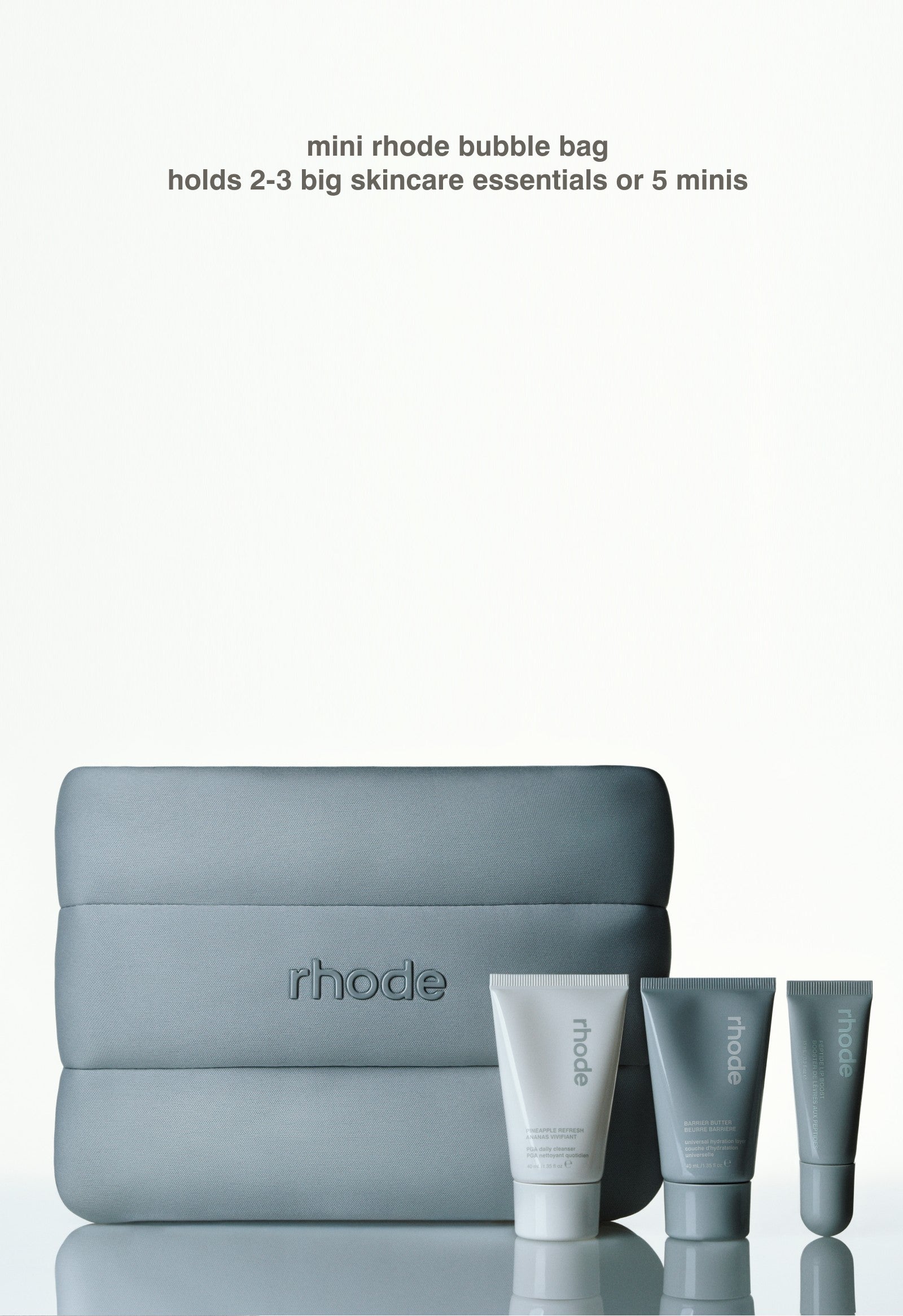 Our signature rhode bubble bag, made mini. Perfect for throwing in your purse and taking on your travels, so your rhode favorites stay in reach. Holds 2-3 big skincare essentials or 5 minis. Size: 9.5" length / 7.5" height.